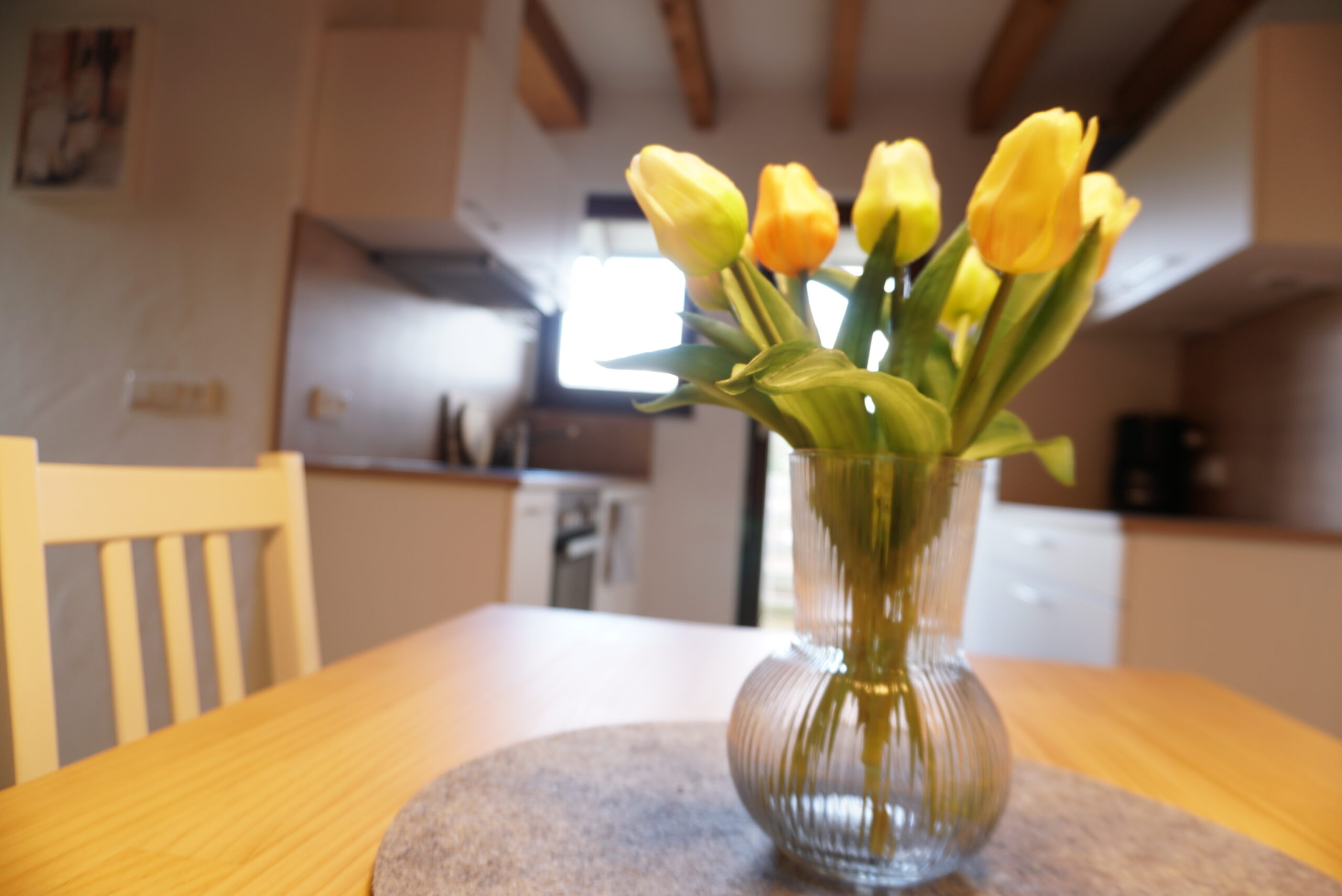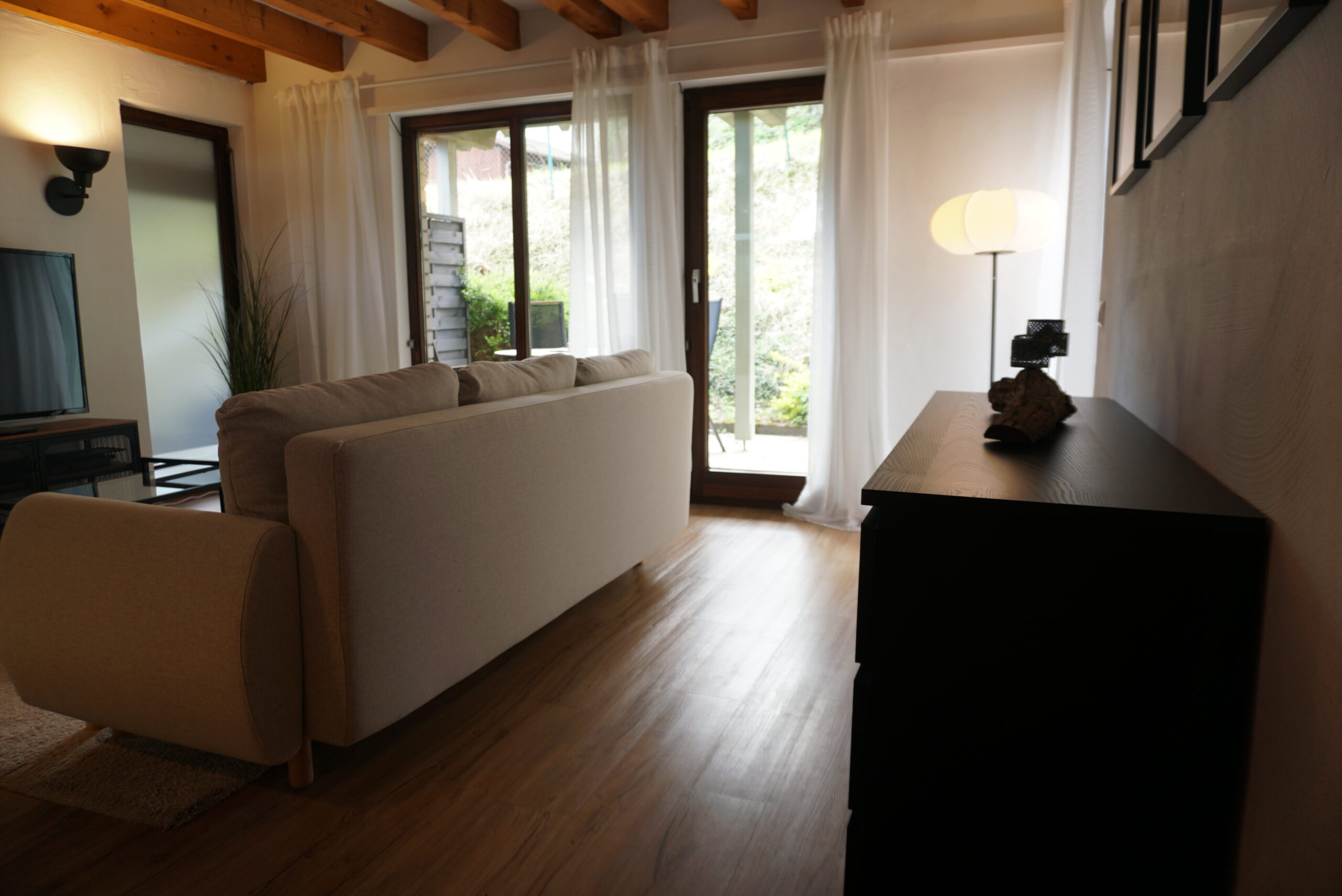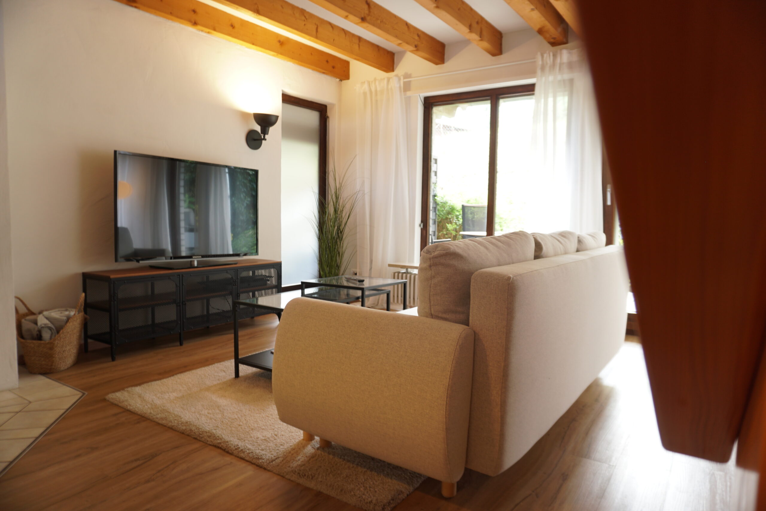 Die geräumige Ferienwohnung ist modern eingerichtet und überzeugt mit stilvollen Holzelementen, die eine warme und gemütliche Atmosphäre schaffen. Ein komfortables Doppelbett sowie ein Schlafsofa bieten Platz für bis zu 4 Personen. Zur Ausstattung gehören außerdem ein Fernseher, eine voll ausgestattete Küche sowie ein Balkon und eine kleine Terrasse.